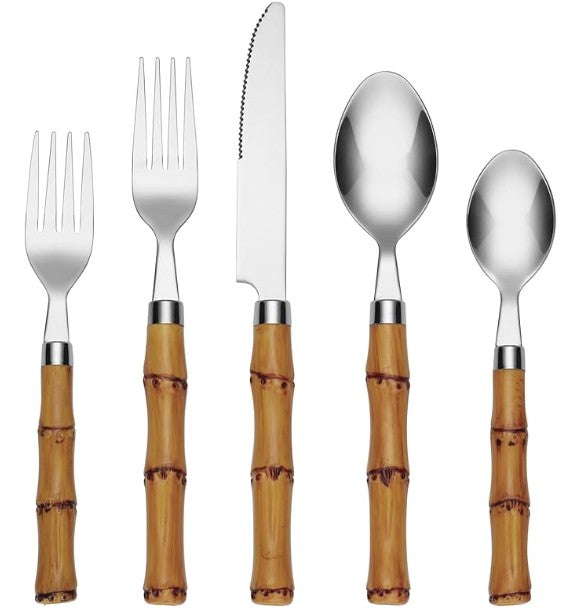 Infuse your table with relaxed elegance. This flatware set features bamboo-inspired handles that bring a touch of tropical charm to any dining experience—perfect for both casual meals and refined gatherings.