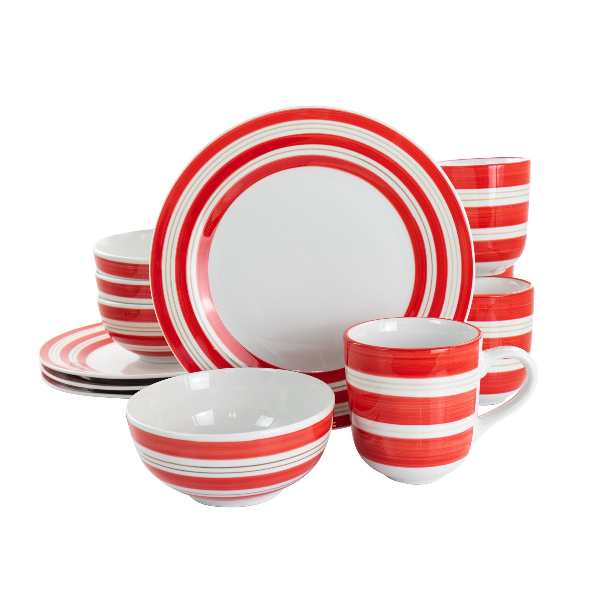 Gibson Home Sunset Stripes 12 Piece Round Fine Ceramic Dinnerware Set in Red