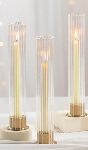 Elevate your ambiance with this elegant set of three ribbed glass hurricane candle holders, designed to add warmth, height, and sophistication to any space or special occasion.
